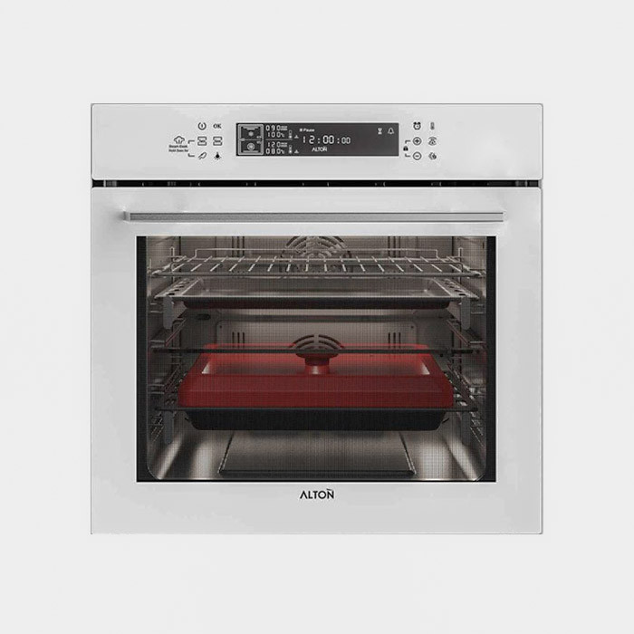 فر توکار آلتون V500TW برقی این فر دارای شیشه اپتیک سفید و twin دوقلو (دارای 2 فر مجزا و امکان تبدیل به یک فر) به همراه بخار پز نمودن و حجم داخلی 72 لیتر و درب 4 جداره جداشونده و صفحه نمایش دیجیتال لمسی و 17 برنامه پخت و قفل کودک و تایمر پیشرفته زمان پخت و برنامه یخ زدایی و سیستم meat probe حسگر پخت گوشت و فن گردش هوای داغ می باشد. ابعاد محصول : 60 x 60 سانت حداقل ابعاد برش داخل کار : عرض 56 x ارتفاع 58 x عمق 54.8 سانتی متر نوع کارکرد : تمام برقی بدون نیاز به لوله کشی گاز حجم گنجایش فر : 72 لیتر نمای فر : شیشه سفید اپتیک صفحه نمایشگر دیجیتال لمسی : دارد فن گردش هوا تنظیم کننده درجه حرارت ( کانوکشن ) : دارد – 2 عدد ریل تلسکوپی :دارد ( 2 طبقه ) به همراه سینی عمیق با ضخامت 3 میلیمتری و پوشش گرانیت موتور جوجه گردان :دارد سیستم آسان تمیز شونده : پوشش داخلی آسان تمیز شونده Easy to Clean دارای 19 برنامه پخت به همراه قابلیت برنامه ریزی به همراه قفل کودک ویژگی بارز :دارای قابلیت بخار پز نمودن سیستم ایمنی خودکار : دارد میزان مصرف انرژی :رده مصرف انرژی برق این محصول A میباشد برنامه meat probe حسگر پخت گوشت : دارد فن خنک کننده اتوماتیک: دارد ( خنک کردن دستگاه پس از اتمام کار ) تایمر دیجیتال :دارد برنامه پخت سریع speed cook :دارد برنامه / قابلیت یخ زدایی :دارد Twin دوقلو (دارای دو فر مجزا و امکان تبدیل شدن به یک فر)