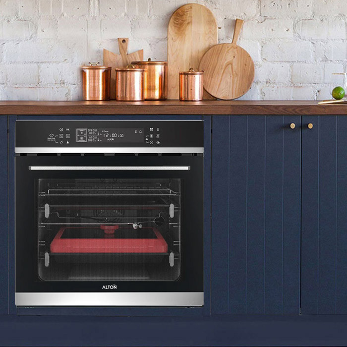 فر توکار آلتون V504T برقی این محصول دارای نمای شیشه سکوریت مشکی با لبه آینه ای میباشد که علاوه بر قابلیت پخت انواع کیک و شیرینی امکان بخار پز نمودن مواد غذایی را هم داراست . فرهای توکار علاوه بر موردی که اشاره کردیم، طراحی بسیار زیبایی هم دارند. یعنی میتوانیم این فرها را در انواع آشپزخانههایی که طراحی مدرن و زیبا دارند مشاهده کنید ابعاد محصول : 60 x 60 سانت حداقل ابعاد برش داخل کار : عرض 56 x ارتفاع 58 x عمق 54.8 سانتی متر نوع کارکرد : تمام برقی بدون نیاز به لوله کشی گاز حجم گنجایش فر : 72 لیتر نمای فر :شیشه مشکی + لبه آینه ای صفحه نمایشگر دیجیتال لمسی :دارد فن گردش هوا تنظیم کننده درجه حرارت ( کانوکشن ) : دارد – 2 عدد ریل تلسکوپی :دارد ( 2 طبقه ) به همراه سینی عمیق با ضخامت 3 میلیمتری و پوشش گرانیت موتور جوجه گردان : دارد سیستم آسان تمیز شونده :پوشش داخلی آسان تمیز شونده Easy to Clean دارای 19 برنامه پخت به همراه قابلیت برنامه ریزی به همراه قفل کودک ویژگی بارز : دارای قابلیت بخار پز نمودن سیستم ایمنی خودکار :دارد میزان مصرف انرژی : رده مصرف انرژی برق این محصول A میباشد برنامه meat probe حسگر پخت گوشت :دارد فن خنک کننده اتوماتیک:دارد ( خنک کردن دستگاه پس از اتمام کار ) تایمر دیجیتال : دارد برنامه پخت سریع speed cook : دارد برنامه / قابلیت یخ زدایی :دارد Twin دوقلو (دارای دو فر مجزا و امکان تبدیل شدن به یک فر)